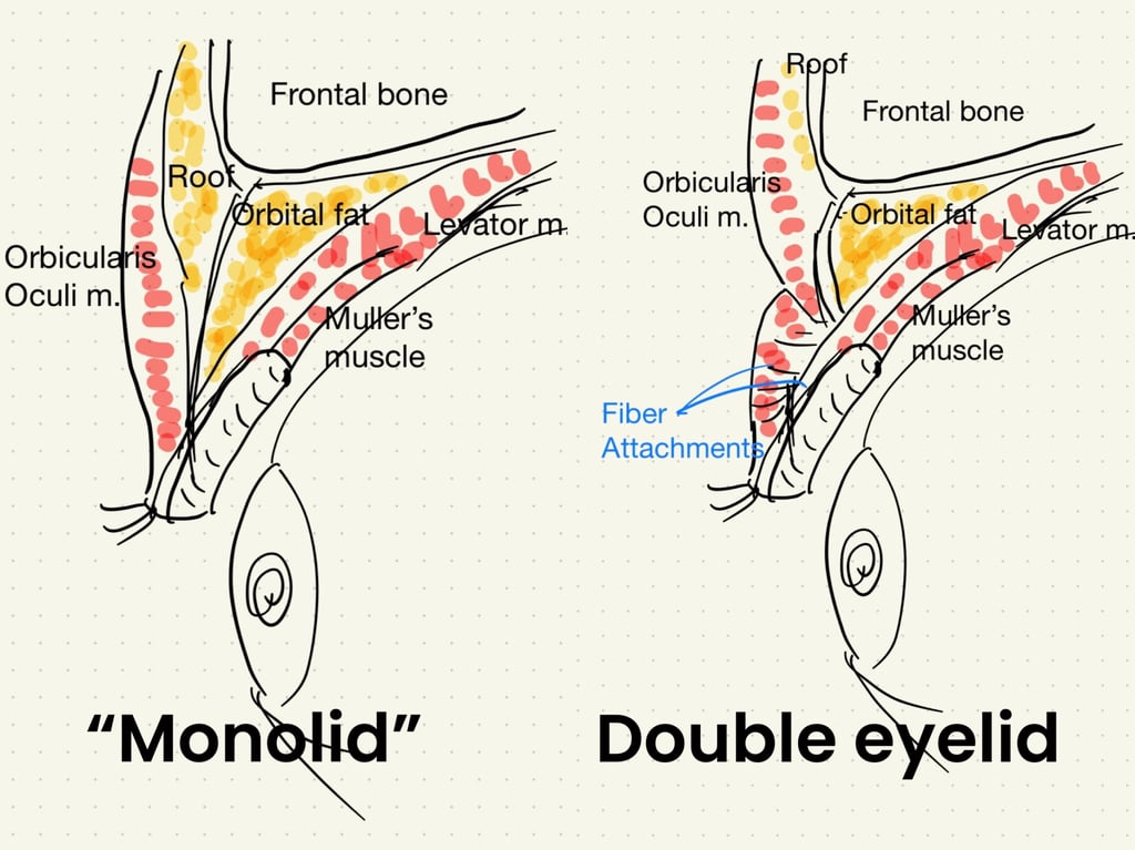 Look at my beautiful sketch. The eyelid with the crease has fibrous attachment between eye dermis and the underneath muscle and cartilage.